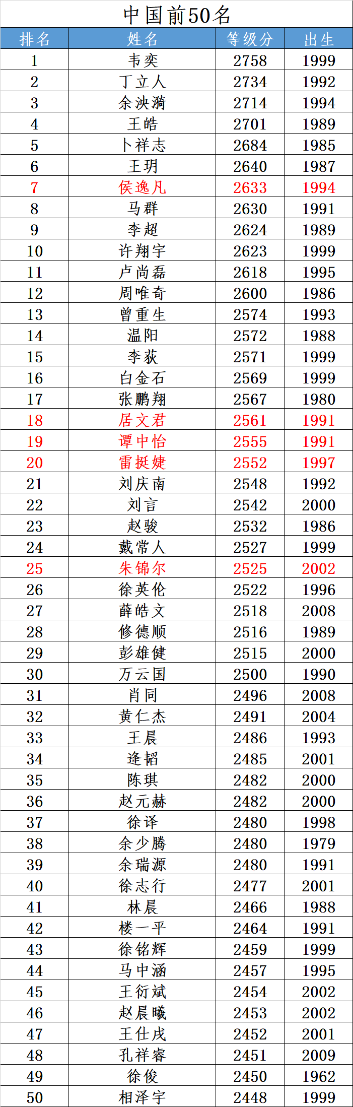 国际象棋等级分 | 中国前50名(2025年4月)